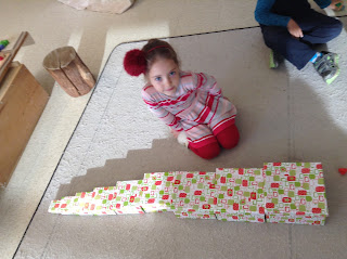 Leah stacked these Christmas boxes by correct size to create a tower.
